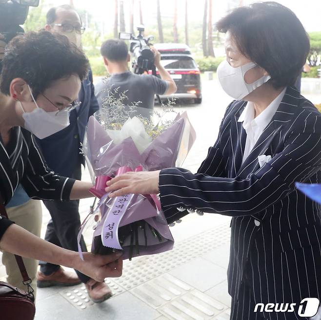 (전주=뉴스1) 유경석 기자 = 추미애 더불어민주당 대선 경선 후보가 17일 전북 전주시 전북도의회 앞에서 지지자에게 꽃다발을 건네받고 있다. 2021.9.17/뉴스1