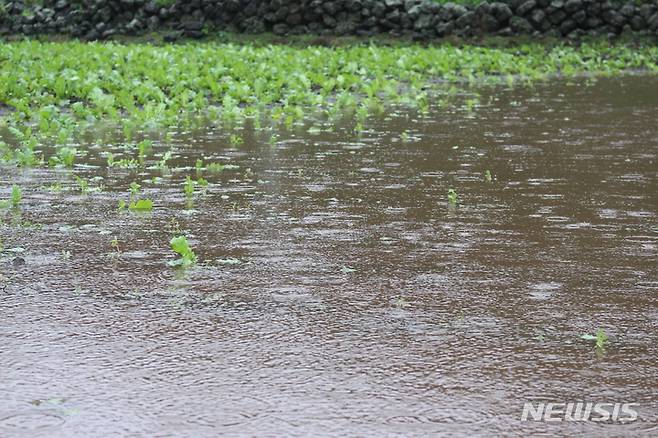 [서귀포=뉴시스] 양영전 기자 = 제14호 태풍 ‘찬투’가 제주를 지나는 17일 오전 서귀포시 성읍면의 한 침수된 월동무밭에 비가 내리고 있다. 2021.09.17. 0jeoni@newsis.com