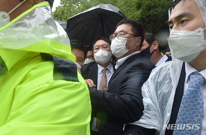 [구미=뉴시스] 이무열 기자 = 윤석열 국민의힘 대선 경선 후보가 17일 오전 경북 구미시 상모동 박정희 전 대통령 생가를 찾아 분향을 마친 뒤 박근혜 전 대통령 구속에 항의하는 보수단체 회원들이 대거 몰리자, 경찰의 호위를 받으며 생가를 나오고 있다. 2021.09.17. lmy@newsis.com