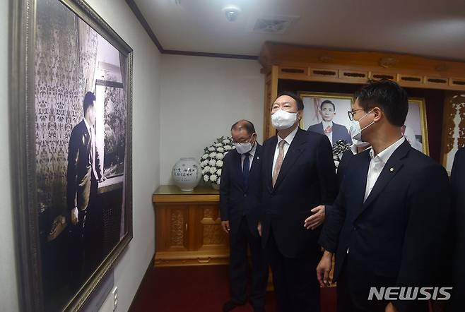 [구미=뉴시스] 이무열 기자 = 윤석열 국민의힘 대선 경선 후보가 17일 오전 경북 구미시 상모동 박정희 전 대통령 생가를 찾아 분향을 마친 뒤 생전 활동사진을 보고 있다. 2021.09.17. lmy@newsis.com