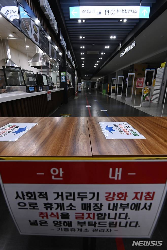 [용인=뉴시스] 김종택기자 = 추석 연휴 기간 고속도로 휴게소 실내 매장 내 취식금지가 시작된 17일 경기도 용인시 경부고속도로 하행선 기흥휴게소 내 식당 운영이 중단되고 있다. 정부는 오늘부터 22일까지 추석 특별교통대책기간으로 정하고 고속도로 휴게소 내 출입구 동선 분리 및 실내취식을 금지한다. 2021.09.17.
