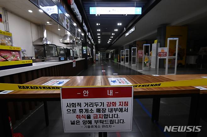 [용인=뉴시스] 김종택기자 = 추석 연휴 기간 고속도로 휴게소 실내 매장 내 취식금지가 시작된 17일 경기도 용인시 경부고속도로 하행선 기흥휴게소 내 식당 운영이 중단되고 있다. 정부는 오늘부터 22일까지 추석 특별교통대책기간으로 정하고 고속도로 휴게소 내 출입구 동선 분리 및 실내취식을 금지한다. 2021.09.17.