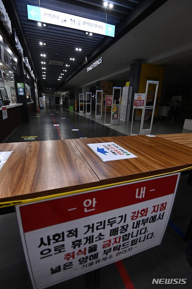 [용인=뉴시스] 김종택기자 = 추석 연휴 기간 고속도로 휴게소 실내 매장 내 취식금지가 시작된 17일 경기도 용인시 경부고속도로 하행선 기흥휴게소 내 식당 운영이 중단되고 있다. 정부는 오늘부터 22일까지 추석 특별교통대책기간으로 정하고 고속도로 휴게소 내 출입구 동선 분리 및 실내취식을 금지한다. 2021.09.17.