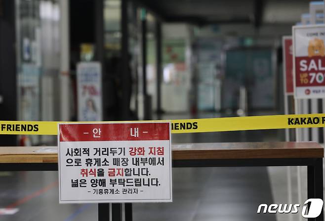 (용인=뉴스1) 김영운 기자 = 추석 연휴 기간 신종 코로나바이러스 감염증(코로나19) 확산 방지를 위해 고속도로 휴게소의 매장 내 취식 금지를 시작한 17일 오전 경기도 용인시 기흥구 경부고속도로 기흥휴게소(부산방향) 내 식당가가 문을 닫아 한산한 모습을 보이고 있다. 국토교통부는 17∼22일 6일간을 '추석 특별교통대책기간'으로 정해 한국도로공사가 관리하는 모든 고속도로 휴게소 실내 매장에서는 좌석 운영이 금지되고 포장만 가능한 방역 강화 지침이 시행된다고 밝혔다. 2021.9.17/뉴스1