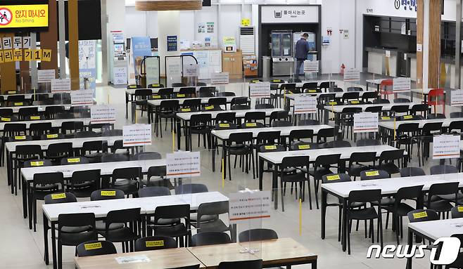 (용인=뉴스1) 김영운 기자 = 추석 연휴 기간 신종 코로나바이러스 감염증(코로나19) 확산 방지를 위해 고속도로 휴게소의 매장 내 취식 금지를 시작한 17일 오전 경기도 용인시 기흥구 경부고속도로 기흥휴게소(부산방향) 내 식당가가 문을 닫아 한산한 모습을 보이고 있다. 국토교통부는 17∼22일 6일간을 '추석 특별교통대책기간'으로 정해 한국도로공사가 관리하는 모든 고속도로 휴게소 실내 매장에서는 좌석 운영이 금지되고 포장만 가능한 방역 강화 지침이 시행된다고 밝혔다. 2021.9.17/뉴스1