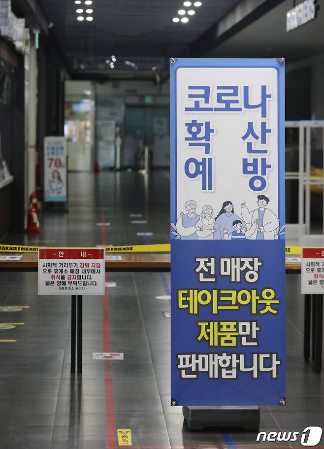(용인=뉴스1) 김영운 기자 = 추석 연휴 기간 신종 코로나바이러스 감염증(코로나19) 확산 방지를 위해 고속도로 휴게소의 매장 내 취식 금지를 시작한 17일 오전 경기도 용인시 기흥구 경부고속도로 기흥휴게소(부산방향) 내 식당가가 문을 닫아 한산한 모습을 보이고 있다. 국토교통부는 17∼22일 6일간을 '추석 특별교통대책기간'으로 정해 한국도로공사가 관리하는 모든 고속도로 휴게소 실내 매장에서는 좌석 운영이 금지되고 포장만 가능한 방역 강화 지침이 시행된다고 밝혔다. 2021.9.17/뉴스1