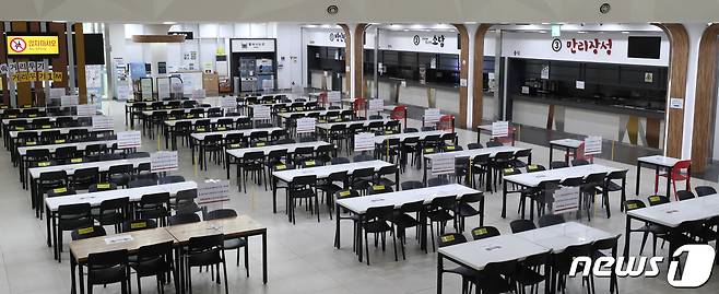 (용인=뉴스1) 김영운 기자 = 추석 연휴 기간 신종 코로나바이러스 감염증(코로나19) 확산 방지를 위해 고속도로 휴게소의 매장 내 취식 금지를 시작한 17일 오전 경기도 용인시 기흥구 경부고속도로 기흥휴게소(부산방향) 내 식당가가 문을 닫아 한산한 모습을 보이고 있다. 국토교통부는 17∼22일 6일간을 '추석 특별교통대책기간'으로 정해 한국도로공사가 관리하는 모든 고속도로 휴게소 실내 매장에서는 좌석 운영이 금지되고 포장만 가능한 방역 강화 지침이 시행된다고 밝혔다. 2021.9.17/뉴스1