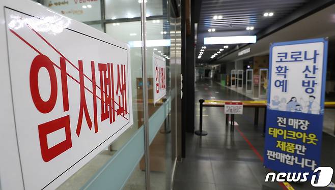 (용인=뉴스1) 김영운 기자 = 추석 연휴 기간 신종 코로나바이러스 감염증(코로나19) 확산 방지를 위해 고속도로 휴게소의 매장 내 취식 금지를 시작한 17일 오전 경기도 용인시 기흥구 경부고속도로 기흥휴게소(부산방향) 내 식당가가 문을 닫아 한산한 모습을 보이고 있다. 국토교통부는 17∼22일 6일간을 '추석 특별교통대책기간'으로 정해 한국도로공사가 관리하는 모든 고속도로 휴게소 실내 매장에서는 좌석 운영이 금지되고 포장만 가능한 방역 강화 지침이 시행된다고 밝혔다. 2021.9.17/뉴스1