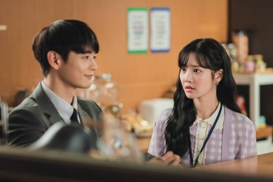 세 사람이 함께 나눈 대화는 과연 무엇일지, 우기를 사이에 둔 유미와 루비의 미묘한 신경전이 궁금증을 더한다. 또 다른 사진에는 유미와 우기의 ‘심쿵’ 모먼트가 포착됐다. 떨어지는 커피잔을 잡으려 동시에 손을 뻗은 두 사람. 손끝에서 전기라도 통한 듯, 서로를 마주 보는 찰나의 순간이 심박수를 높인다.