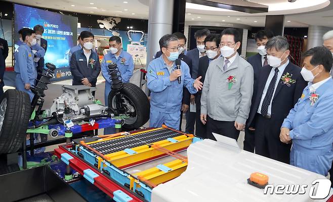 (광양=뉴스1) 전원 기자 = 17일 포스코 광양 기술연구원에서 열린 포스코 기가스틸 생산체제 준공식에 참석한 김영록 전라남도지사가 전시관을 둘러보고 있다.(전남도 제공) 2021.9.17/뉴스1