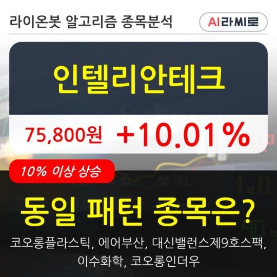 이 시각 거래소에서 인텔리안테크 이외에도 코오롱플라스틱(26.17%), 에어부산(19.55%), 대신밸런스제9호스팩(21.38%), 이수화학(12.05%), 코오롱인더우(10.22%) 등이 상승세를 보이고 있다.