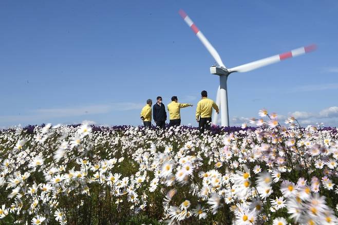 [거창=쿠키뉴스] 최일생 기자 = 맑은 가을하늘과 풍력기를 배경으로 거창 감악산 정상에는 보랏빛의 아스타와 하얀 구절초가 만개해 장관을 이루고 있다.