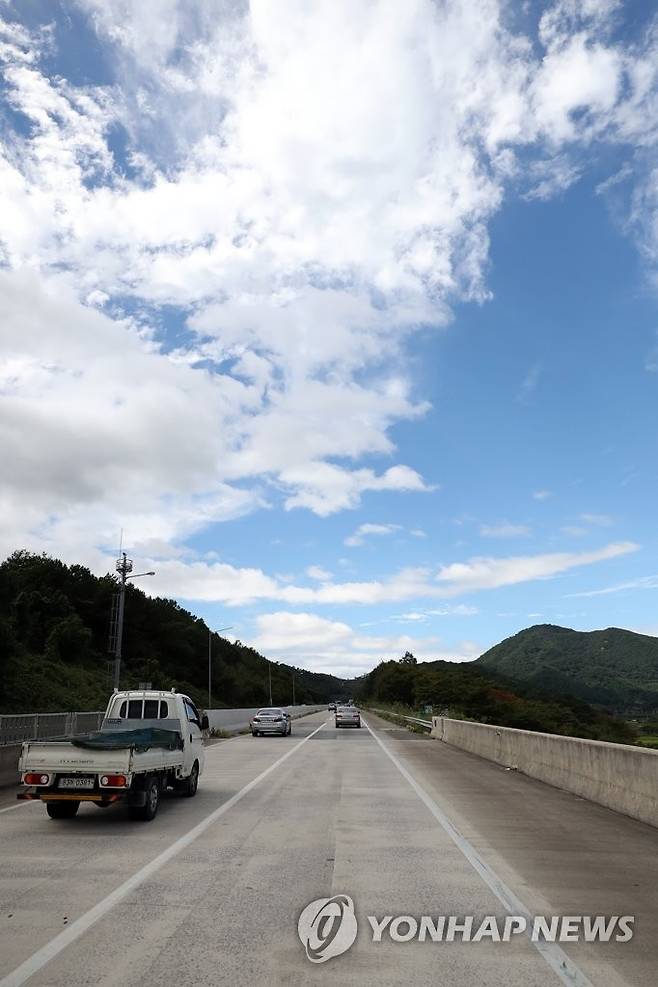 (순천=연합뉴스) 정회성 기자 = 제14호 태풍 '찬투'의 영향권에서 벗어나기 시작한 17일 오후 전남 순천시 승주읍 호남고속도로 상행선 구간이 맑게 갠 하늘 아래 원활한 흐름을 보인다. 2021.9.17