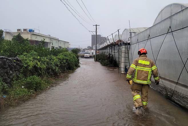 [제주=뉴시스] 우장호 기자 = 제14호 태풍 '찬투(CHANTHU)'가 제주를 통과한 17일 오전 제주시 이호2동의 마을 도로가 침수돼 출동한 소방대원들이 배수지원 활동을 하고 있다. (사진=제주소방서 제공) 2021.09.17. woo1223@newsis.com *재판매 및 DB 금지