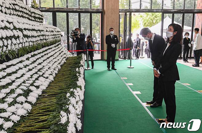 (서울=뉴스1) = 노소영 아트센터 나비 관장(오른쪽)과 노재헌 동아시아문화센터 이사장이 17일 서울 여의도순복음교회 대성전 1층 베다니홀에 마련된 고 조용기 원로목사의 빈소에서 조문하고 있다. (국민일보 제공) 2021.9.17/뉴스1