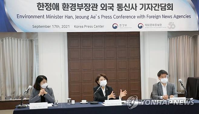 (서울=연합뉴스) 한정애 환경부 장관이 17일 오후 서울 중구 한국프레스센터에서 열린 외국 통신사 기자간담회에서 '2050 탄소중립 이행계획'과 관련한 주요 환경정책 현안 질의에 답변하고 있다. 2021.9.17