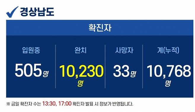 경상남도는 16일 오후 5시 대비 17일 오후 1시 기준 신규 확진자는 13명(경남 10759~10771번)이 발생해 누적 확진자는 1만768명이다고 밝혔다.