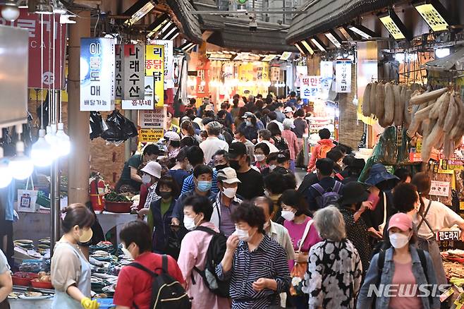 [수원=뉴시스] 김종택기자 = 민족대명절 추석을 나흘 앞둔 17일 경기도 수원시 팔달구 못골시장에 명절 상차림 준비를 위해 장보러 온 시민들로 북적이고 있다. 2021.09.17.