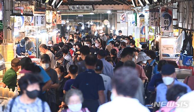 [수원=뉴시스] 김종택기자 = 민족대명절 추석을 나흘 앞둔 17일 경기도 수원시 팔달구 못골시장에 명절 상차림 준비를 위해 장보러 온 시민들로 북적이고 있다. 2021.09.17.