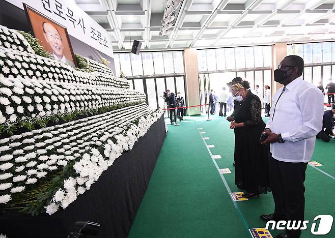 (서울=뉴스1) = 윌버 시무사 주한 잠비아대사가 17일 서울 여의도순복음교회 대성전 1층 베다니홀에 마련된 고 조용기 원로목사의 빈소에서 조문을 하고 있다. (국민일보 제공) 2021.9.17/뉴스1