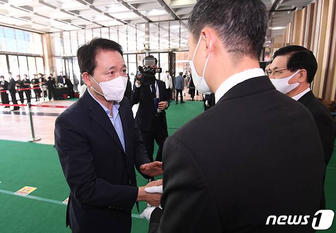 (서울=뉴스1) = 성일종 국민의힘 의원이 17일 서울 여의도순복음교회 대성전 1층 베다니홀에 마련된 고 조용기 원로목사의 빈소에서 조민제 국민일보 회장과 인사하고 있다. (국민일보 제공) 2021.9.17/뉴스1