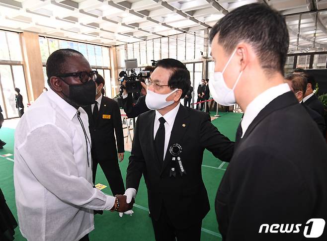 (서울=뉴스1) = 윌버 시무사 주한 잠비아대사가 17일 서울 여의도순복음교회 대성전 1층 베다니홀에 마련된 고 조용기 원로목사의 빈소에서 조민제 국민일보 회장과 인사하고 있다. (국민일보 제공) 2021.9.17/뉴스1