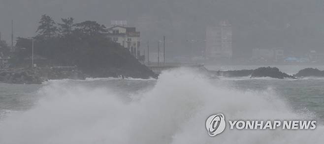 (울산=연합뉴스) 김용태 기자 = 17일 오후 제14호 태풍 '찬투'의 영향으로 울산시 북구 정자해변에 거센 파도가 몰아치고 있다. 2021.9.17