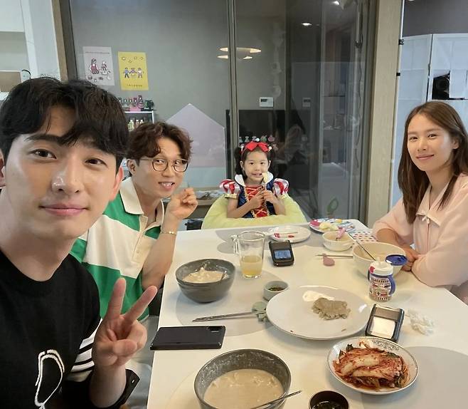 공개된 사진 속 박성광은 윤박, 조윤희·로아 모녀와 함께 식탁에서 포즈를 취한 모습이다.