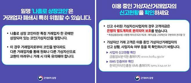 당국은 "사업자가 신고를 마쳤더라도 자금세탁 관련 요건을 충족한 것일 뿐 해킹, 불법행위 등으로 인한 피해 가능성은 여전히 존재한다"면서 "가상자산의 가치는 그 누구도 보장하지 못하므로 투자에 유의해야 한다"고 말했습니다.