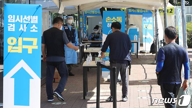 (용인=뉴스1) 김영운 기자 = 17일 오후 경기도 용인시 처인구 영동고속도로 용인휴게소(인천방향)에 설치된 임시선별검사소에서 시민들이 신종 코로나바이러스 감염증(코로나19) 검체 검사를 받기 위해 줄을 서 있다. 중앙재난안전대책본부는 추석 연휴에도 기존 여름 휴가철에 설치된 경부고속도로 안성휴게소(서울방향) , 중부고속도로 이천휴게소(하남방향), 서해안고속도로 화성휴게소(서울방향), 영동고속도로 용인휴게소(인천방향)의 임시선별검사소 4곳을 연장 운영한다고 밝혔다 2021.9.17/뉴스1