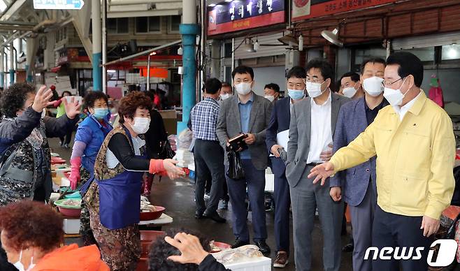 (여수=뉴스1) 전원 기자 = 김영록 전라남도지사가 추석 명절을 앞둔 17일 여수시 교동전통시장을 방문, 지역상품권으로 주요 성수품을 구매하며 코로나로 어려움을 겪고 있는 상인들을 격려하고 있다.(2021.9.17/뉴스1