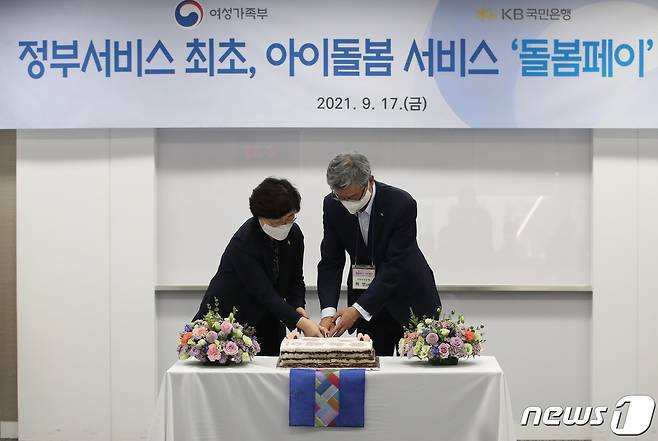 (서울=뉴스1) 송원영 기자 = 정영애 여성가족부 장관과 허인 KB국민은행 은행장이 17일 서울 종로구 정부서울청사에서 열린 아이돌봄 간편결제서비스 '돌봄페이' 오픈 행사에서 떡을 자르고 있다. 이번 행사는 아이돌봄사업 주거래은행인 KB국민은행과 지난 4월 업무협약을 체결해 추진한 '돌봄페이'와 '돌봄톡톡' 서비스의 개통을 국민들과 서비스 이용자들에게 널리 알리기 위해 마련됐다.돌봄페이와 돌봄톡톡 서비스는 아이돌봄서비스 모바일 애플리케이션(앱)에서 사용하는 간편결제서비스와 채팅 서비스를 각각 말한다. 2021.9.17/뉴스1