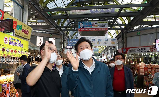 (서울=뉴스1) 김명섭 기자 = 오세훈 서울시장이 17일 서울 양천구 신영시장에서 추석 명절 민생물가 및 코로나19 방역상황 점검을 하고 있다. 2021.9.17/뉴스1