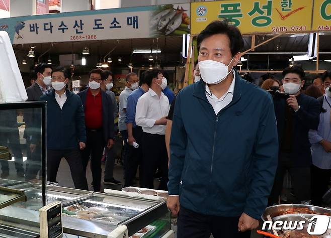 (서울=뉴스1) 김명섭 기자 = 오세훈 서울시장이 17일 서울 양천구 신영시장에서 추석 명절 민생물가 및 코로나19 방역상황 점검을 하고 있다. 2021.9.17/뉴스1