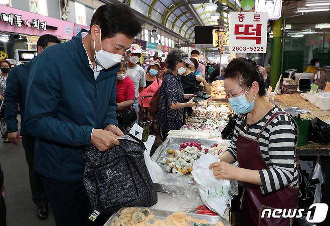 (서울=뉴스1) 김명섭 기자 = 오세훈 서울시장이 17일 서울 양천구 신영시장에서 추석 명절 민생물가 및 코로나19 방역상황 점검을 하고 있다. 2021.9.17/뉴스1