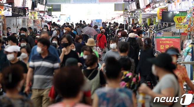 (서울=뉴스1) 김명섭 기자 = 본격적인 추석연휴를 앞두고 17일 서울 양천구 신영시장에서 시민들이 장을 보고 있다. 2021.9.17/뉴스1