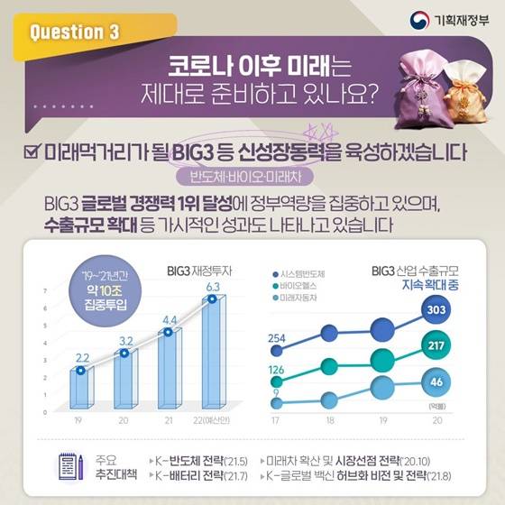- 미래먹거리가 될 BIG3 등 신성장동력을 육성하겠습니다.
