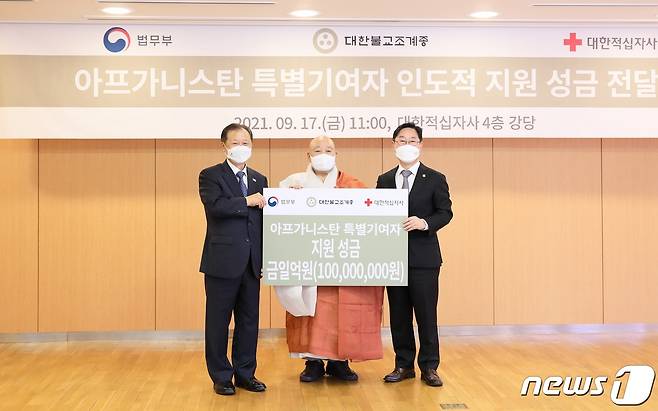 (서울=뉴스1) = 대한불교조계종 총무원장 원행스님(가운데)이 17일 오전 서울 중구 대한적십자사 서울사무소에서 신희영 대한적십자사 회장(왼쪽), 박범계 법무부 장관에게 아프가니스탄 특별기여자 인도적 지원을 위한 1억원을 기부한 후 기념촬영을 하고 있다.(대한적십자사 제공) 2021.9.17/뉴스1