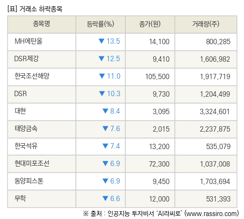17일 거래소 기준으로 하락한 종목은 MH에탄올(023150) -13.5%, DSR제강(069730) -12.5%, 한국조선해양(009540) -12.5% 등이 있다.