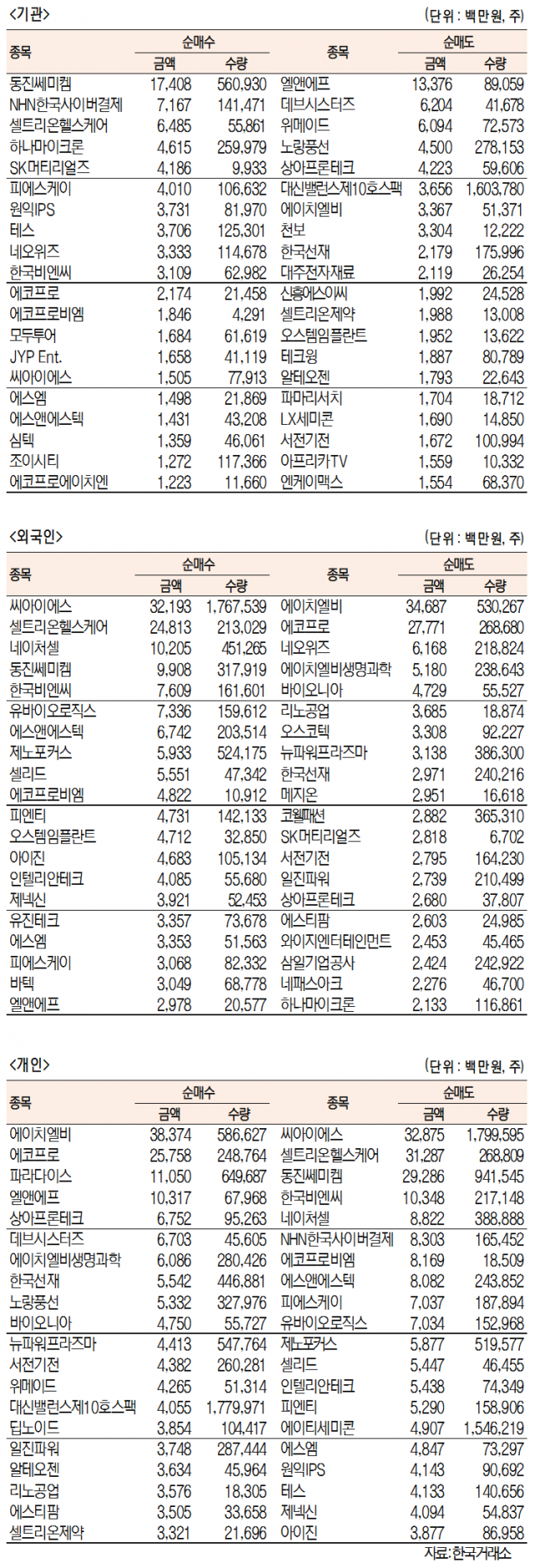 [표]코스닥 기관·외국인·개인 순매수·도 상위종목(9월 17일) [