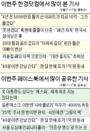 네티즌이 이번주 한경닷컴에서 가장 많이 본 기사는 9월 15일자 <“4년 전 5000만원 들여 산 아파트가 지금 10억…그가 옳았다”>였다. 연일 집값이 급등하면서 부동산에 투자한 이들과 그렇지 않은 이들 사이에 자산 불평등이 커지고 있다는 내용을 다뤘다.