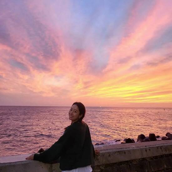 사진 속 전혜빈은 아름다운 바다와 하늘을 배경으로 미소를 지으며 포즈를 취하고 있다.