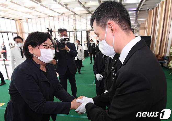 (서울=뉴스1) = 이혜훈 전 국회의원이 17일 서울 여의도순복음교회 대성전 1층 베다니홀에 마련된 고 조용기 원로목사의 빈소에서 조민제 국민일보 회장과 인사하고 있다. (국민일보 제공) 2021.9.17/뉴스1
