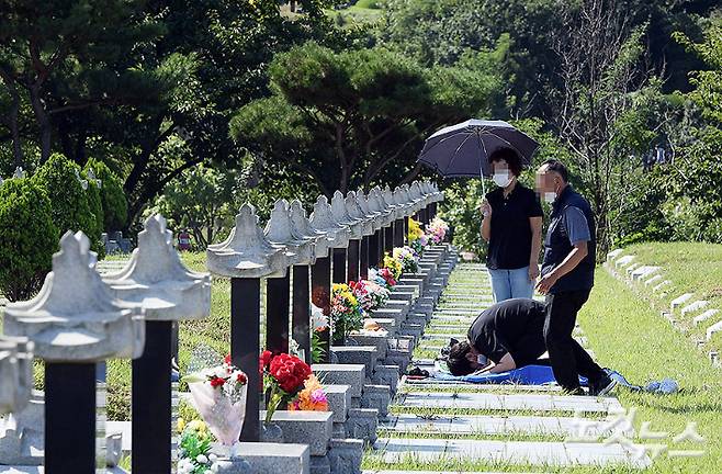 추석 명절이 일주일 앞으로 다가온 12일 인천 부평구 인천가족공원에서 시민들이 미리 성묘를 하고 있다. 인천가족공원은 코로나19 확산에 따라 추석 연휴기간인 9월18일부터 22일까지 화장장을 제외한 전 시설을 폐쇄한다. 이한형 기자