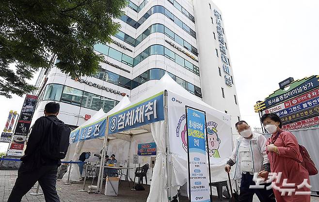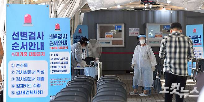 13일 오후 서울 광진구 동서울터미널 앞에 마련된 코로나19 임시선별진료소 모습. 추석 특별 방역 대책으로 일부 휴게소와 철도 역, 터미널에서 추가 선별검사소가 운영되고 17일부터는 고속도로 휴게소 취식이 금지된다. 이한형 기자
