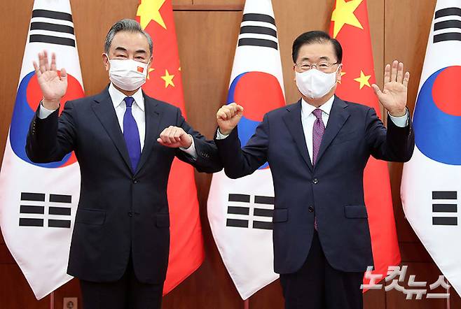 정의용 외교부 장관(오른쪽)과 왕이 중국 외교부장이 15일 오전 외교부 청사에서 회담 전 기념촬영을 하고 있다. 10개월 만에 한국을 다시 찾은 왕이 외교부장은 "한국과 중국은 이사갈 수 없는 이웃"이라며 외교장관회담을 시작했다. 박종민 기자