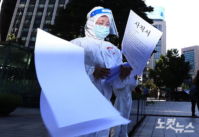 민주노총 공공운수노조 의료연대본부 소속 간호사들이 15일 서울시청 앞에서 열린 '코로나19 간호인력기준 발표하지 않는 서울시 규탄' 기자회견에서 지난해 1월부터 올해 7월까지 인력충원을 기다리다 서울대병원·보라매병원·서울의료원을 떠난 동료 간호사 700여명의 사직서를 모아 제출하는 퍼포먼스를 선보이고 있다. 황진환 기자