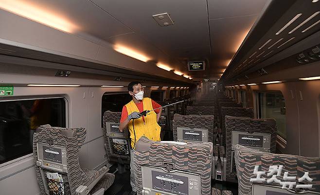 추석 연휴를 앞둔 16일 오후 서울 강남구 SRT수서역에서 관계자들이 열차 방역 작업을 하고 있다. 이한형 기자