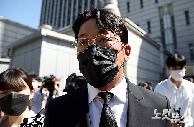 프로포폴 불법 투약 혐의로 기소된 배우 하정우(본명 김성훈)가 14일 오후 서울중앙지법에서 열린 1심 선고 공판을 마치고 법원을 나서며 취재진 질문에 답하고 있다. 하정우는 1심 선고에서 벌금 3000만원에 추징금 8만8749원을 선고 받았다. 이한형 기자