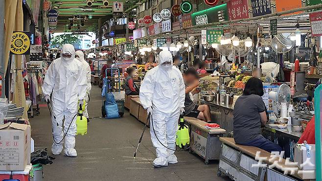 추석 연휴를 앞둔 16일 오전 서울 종로구 광장시장에서 방역 관계자들이 시장 곳곳을 돌며 방역을 하고 있다. 이한형 기자